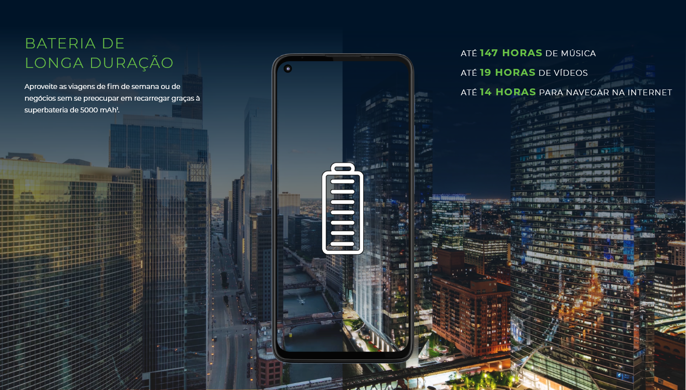Todas as informações referentes à duração da bateria são estimativas e baseiam-se em um usuário regular testado em um perfil de uso misto, que inclui o tempo de uso e de espera, em condições ótimas de rede. O desempenho real da bateria pode variar e depende de muitos fatores, como intensidade do sinal, configurações do dispositivo e da rede, temperatura, condição da bateria e padrões de uso.